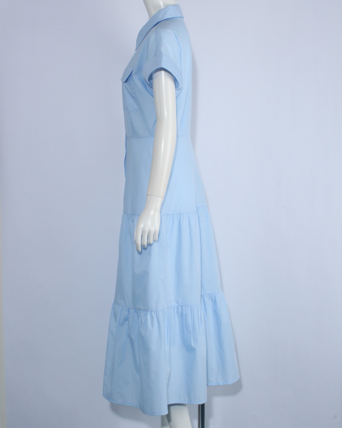 胸元にポケットがついた布帛のワンピースです。スカートはギャザーが入った段々になっていてふんわりとしています。共布ベルト付き。