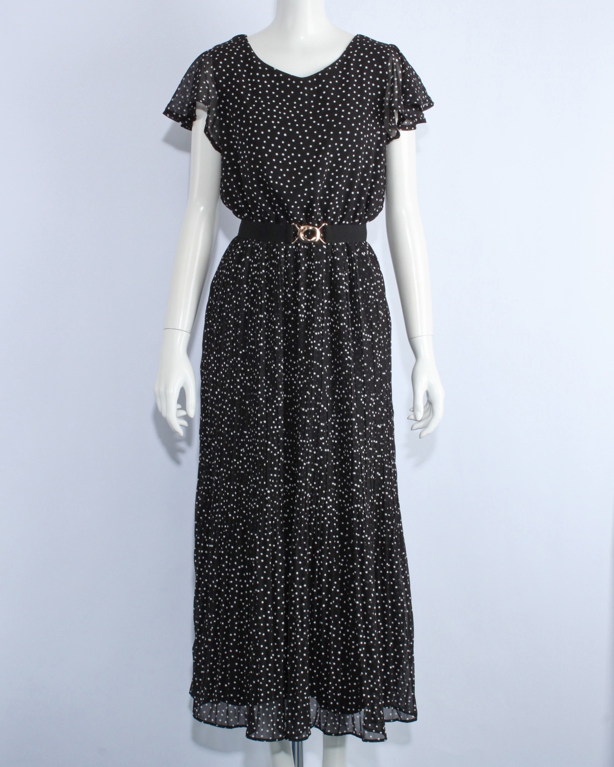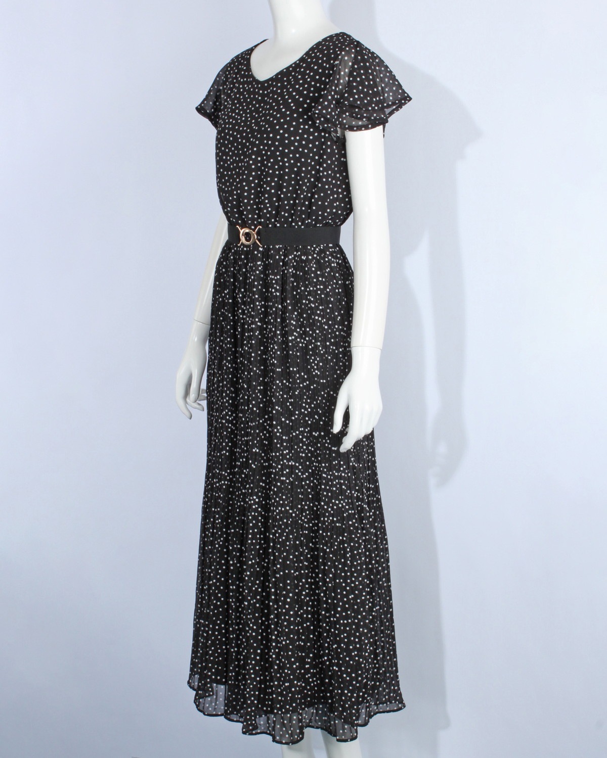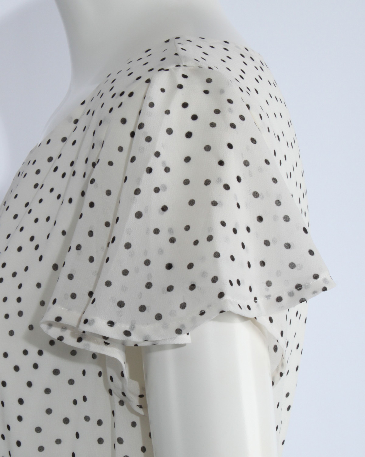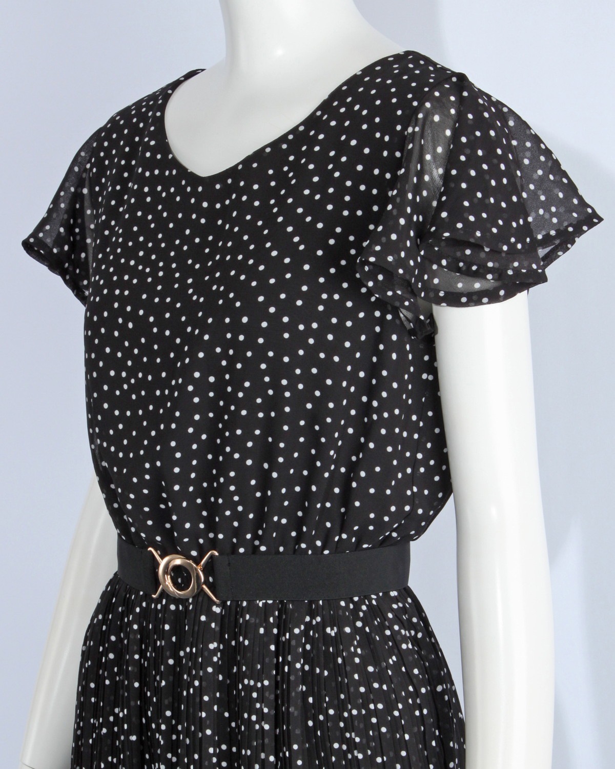 袖がフレアーになったシフォンワンピースです。ウエストゴム仕様。無地とドット柄の2タイプ。ゴムベルト付き。