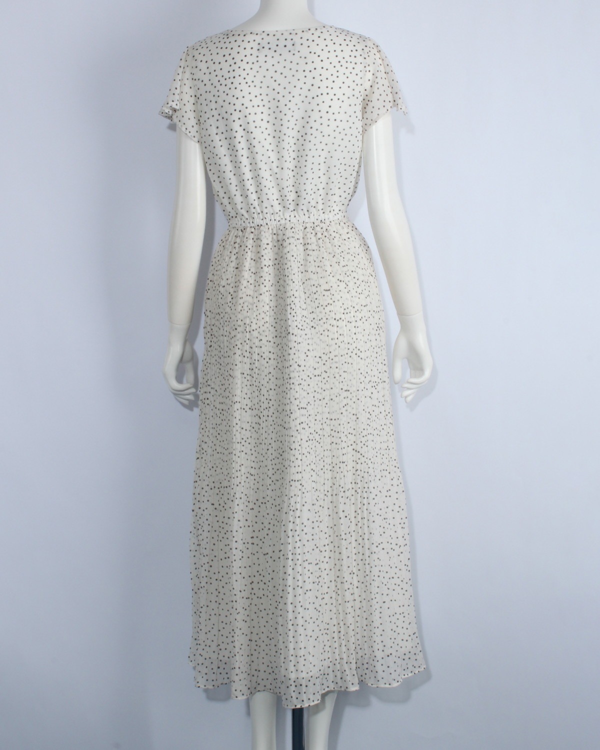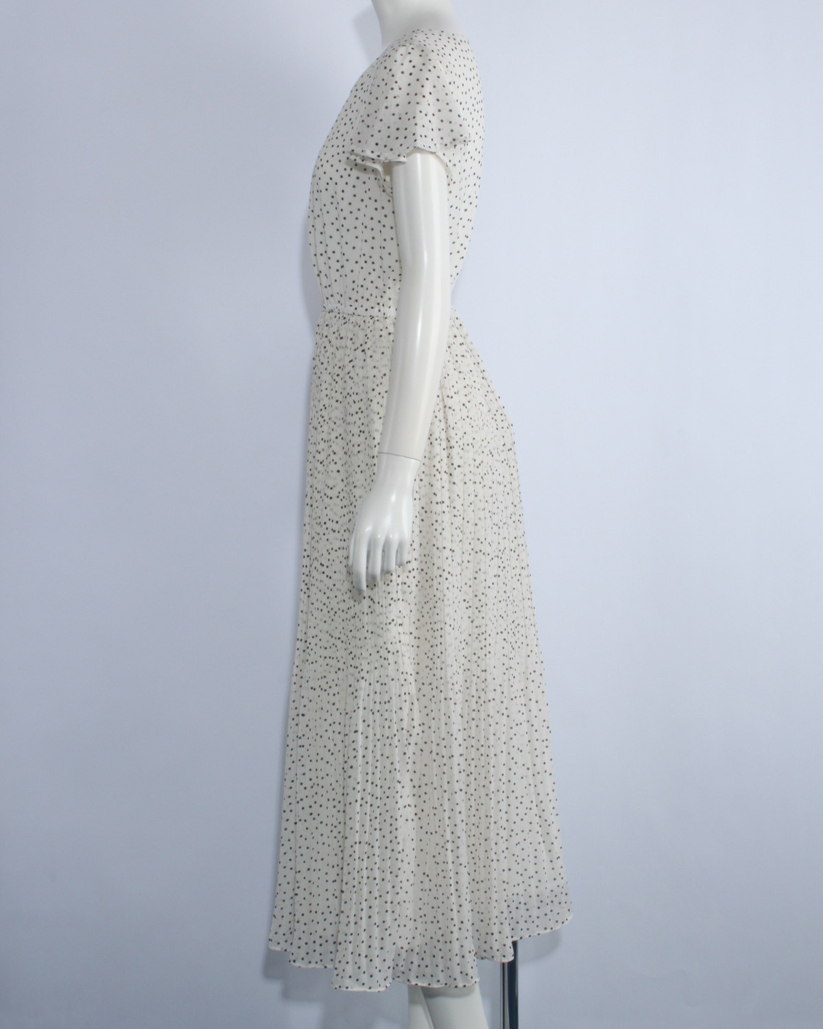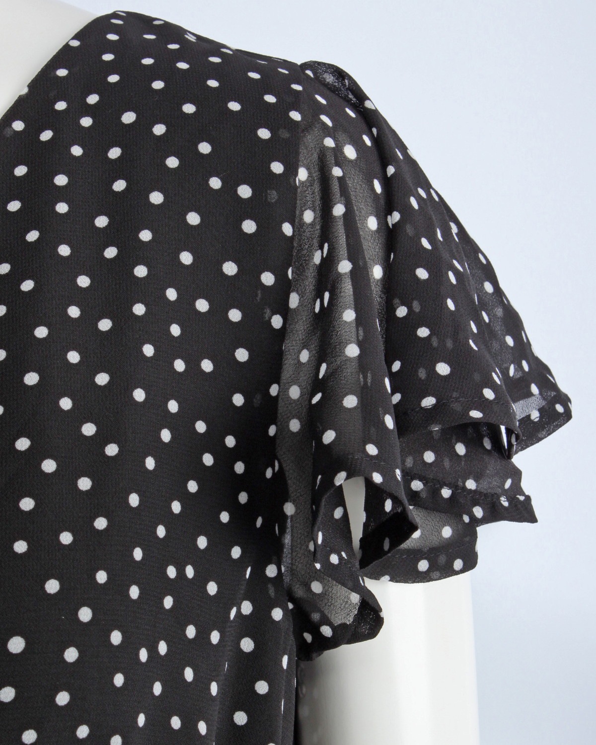 袖がフレアーになったシフォンワンピースです。ウエストゴム仕様。無地とドット柄の2タイプ。ゴムベルト付き。
