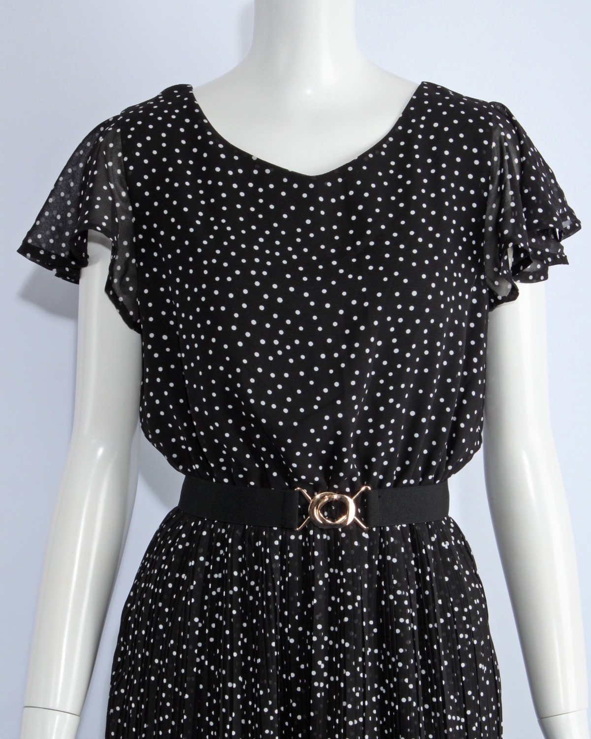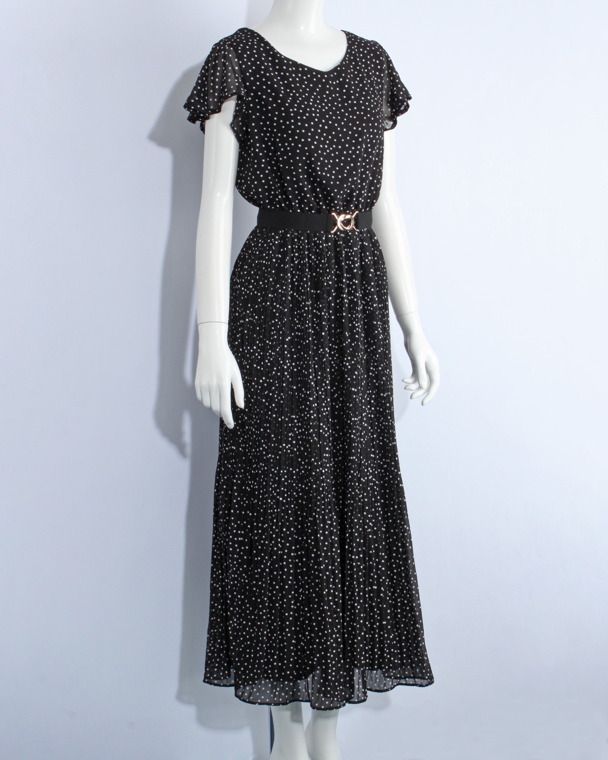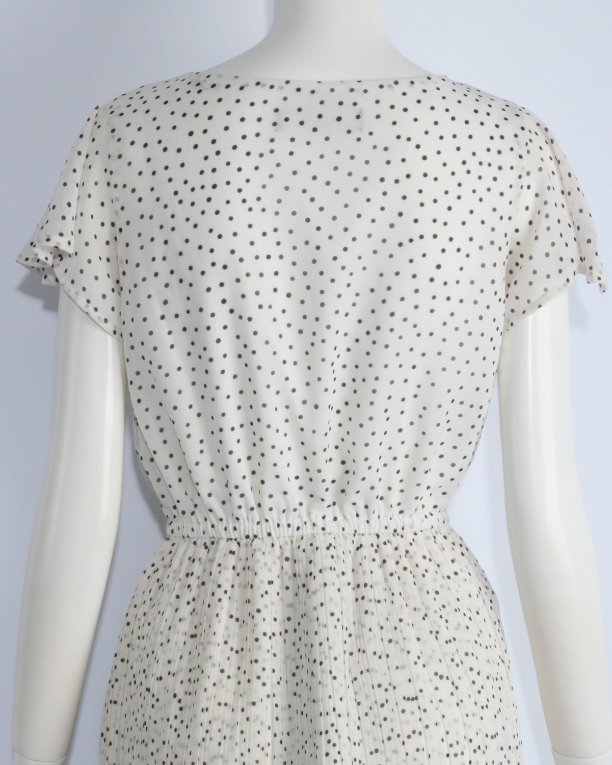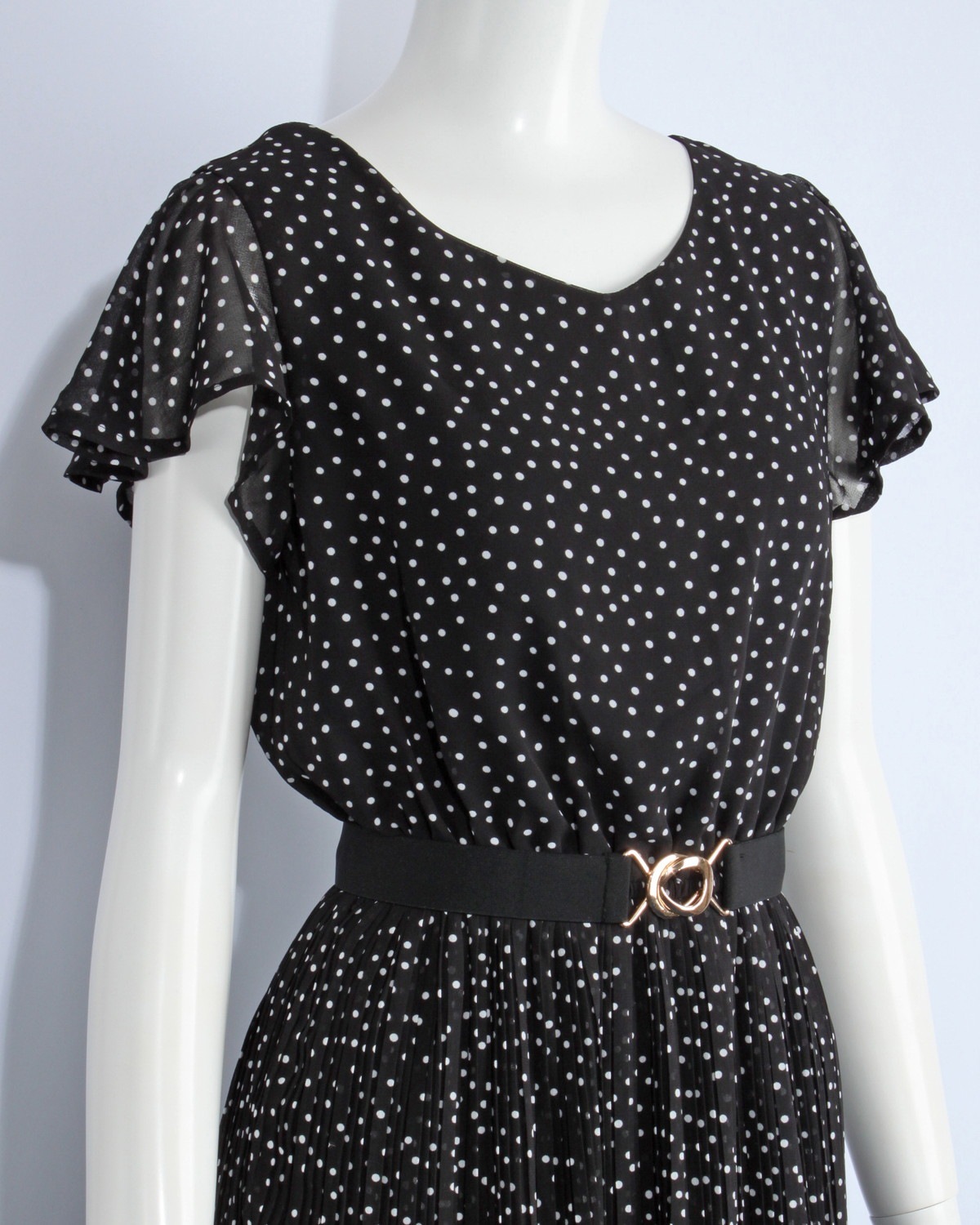 袖がフレアーになったシフォンワンピースです。ウエストゴム仕様。無地とドット柄の2タイプ。ゴムベルト付き。