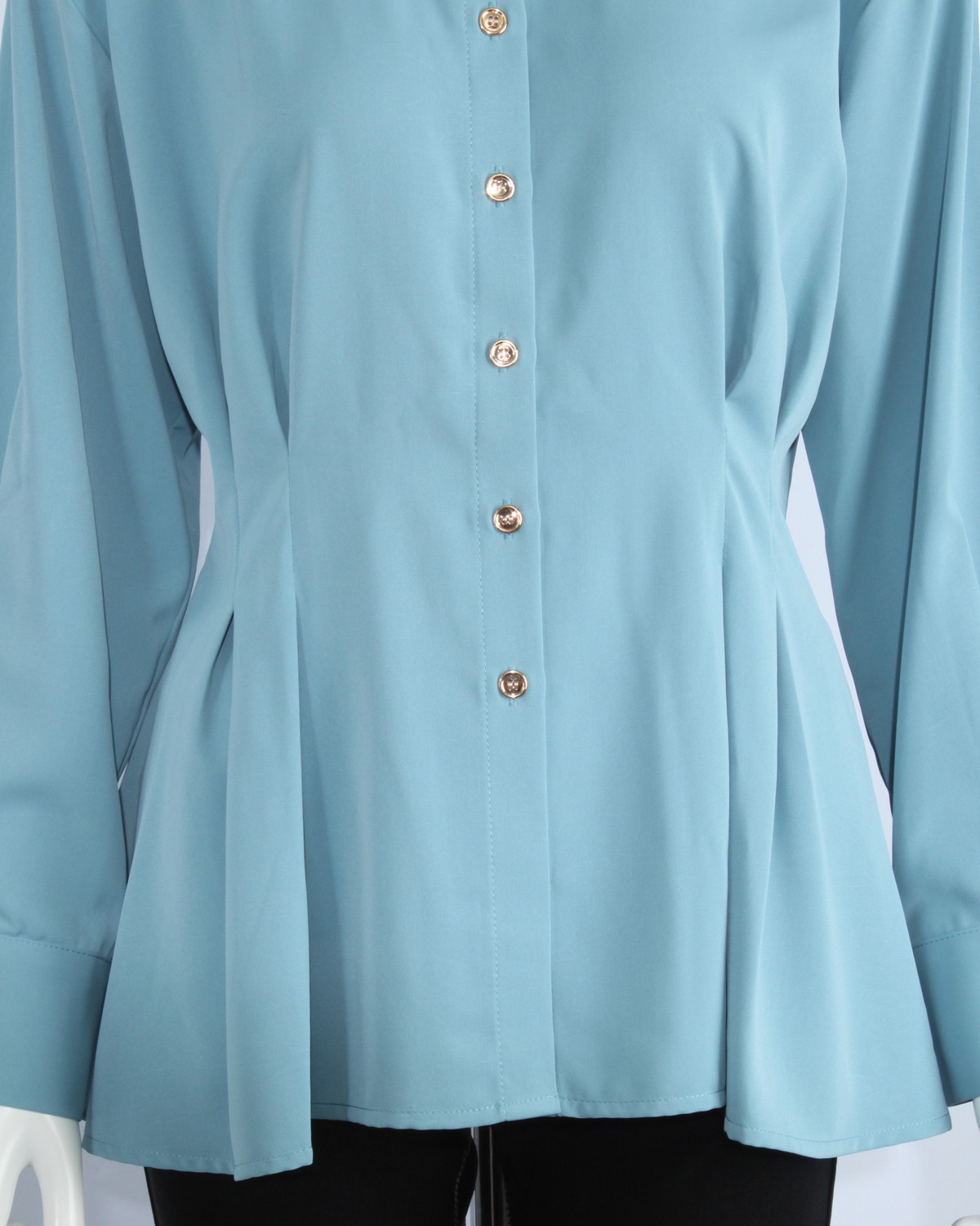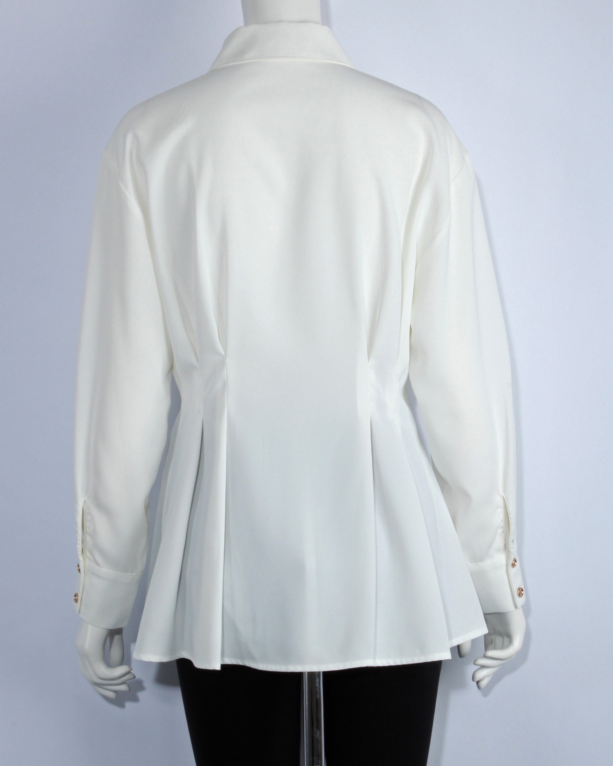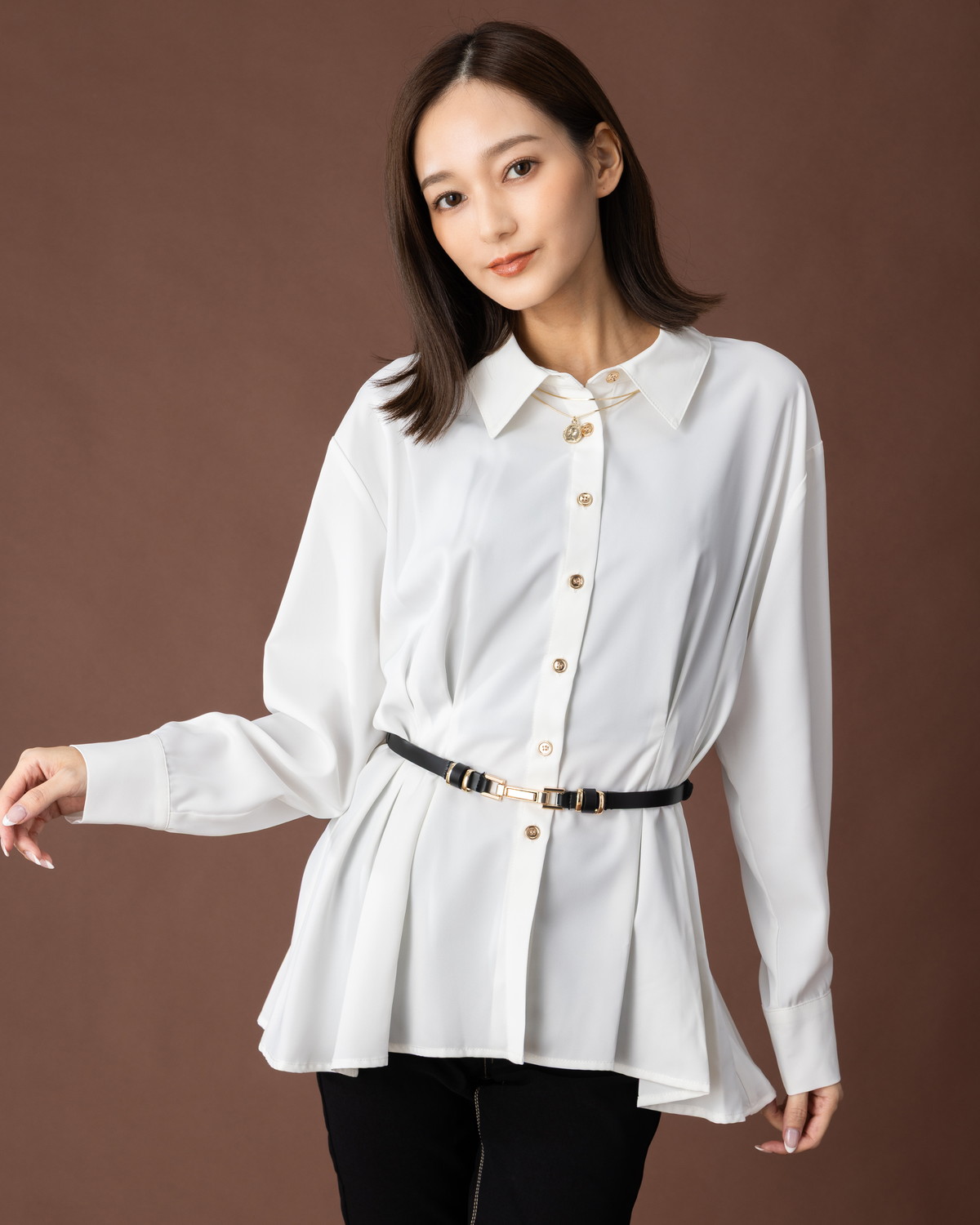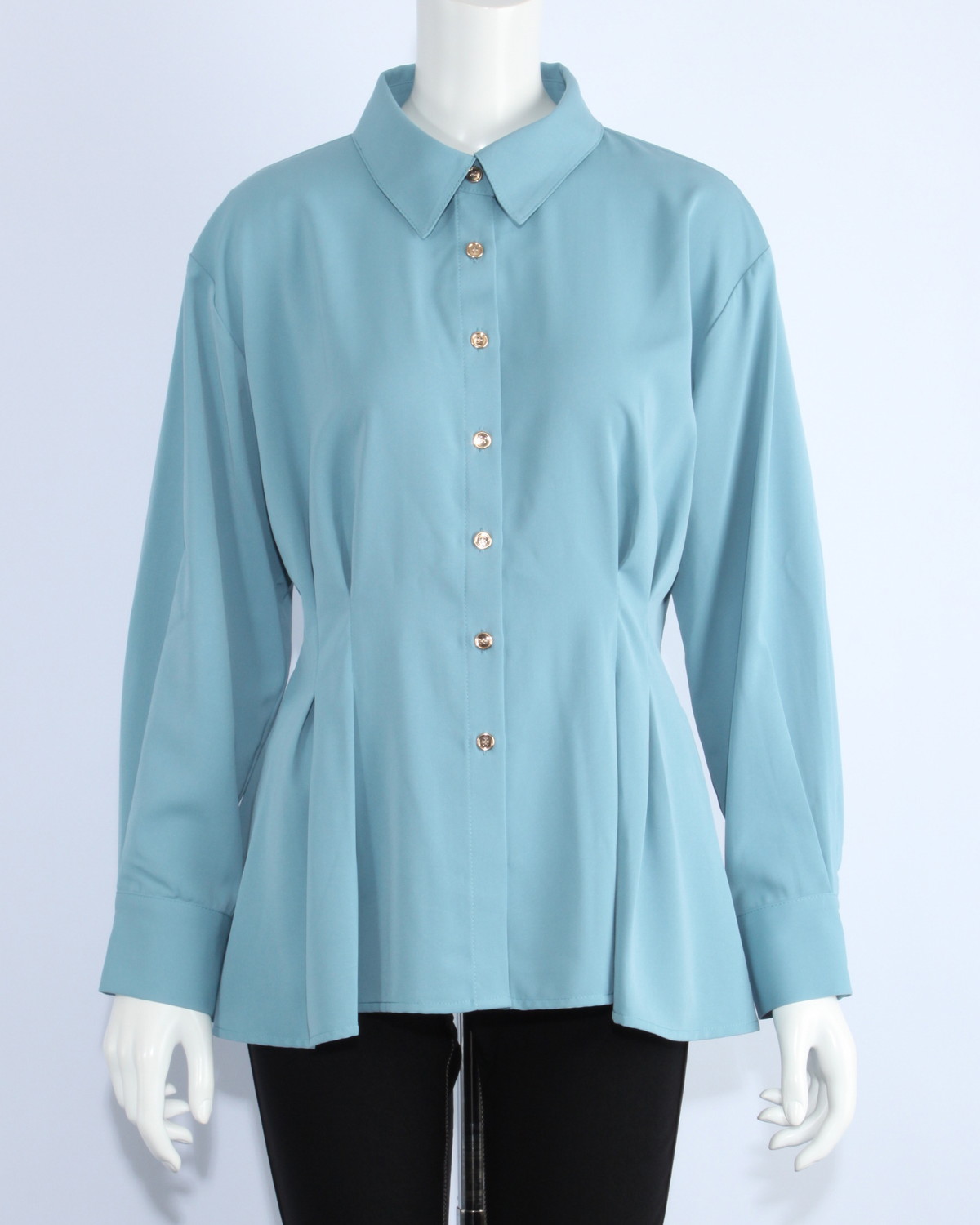 ペプラムデザインのシャツです。ゴールド釦が華やかさをプラスします。