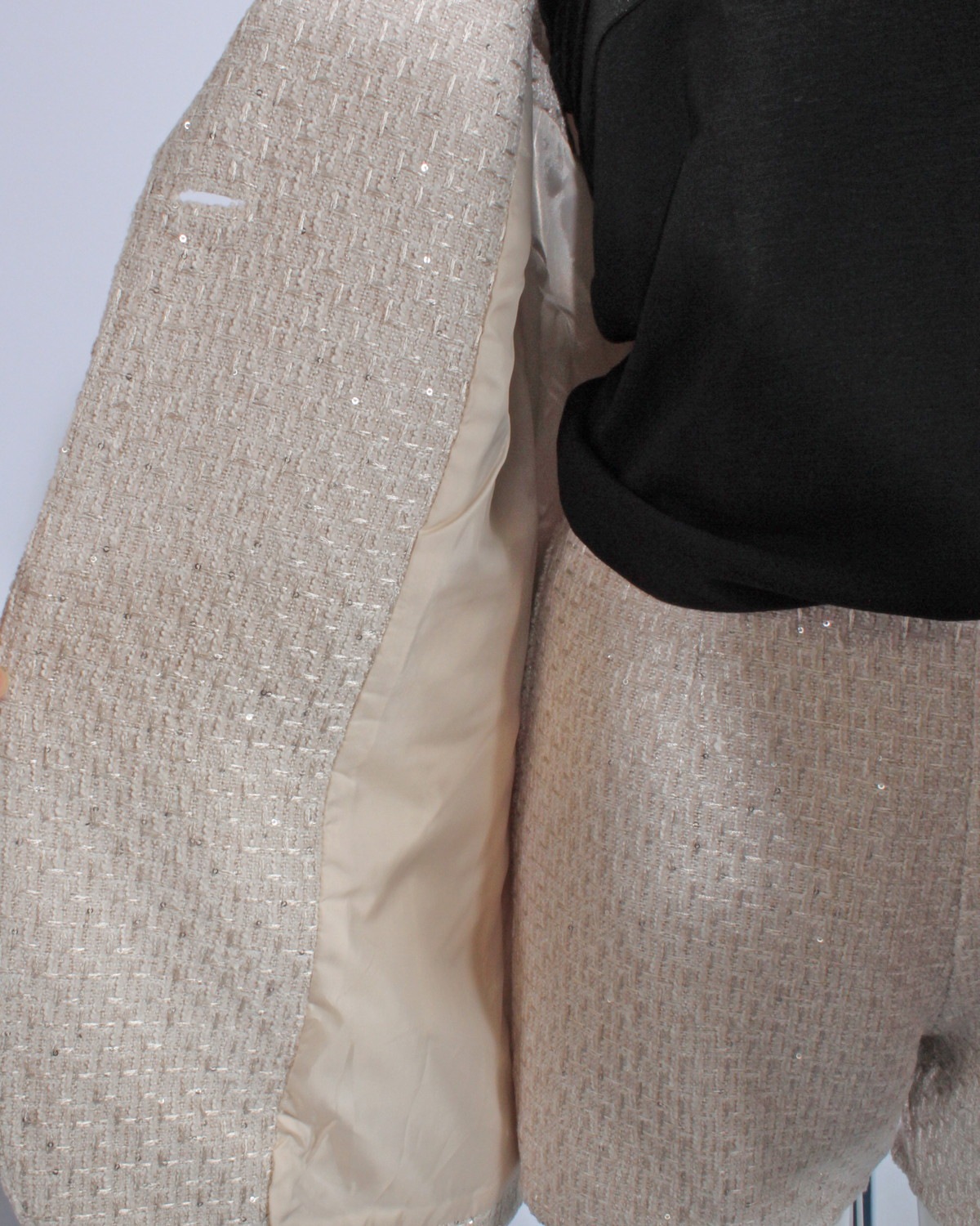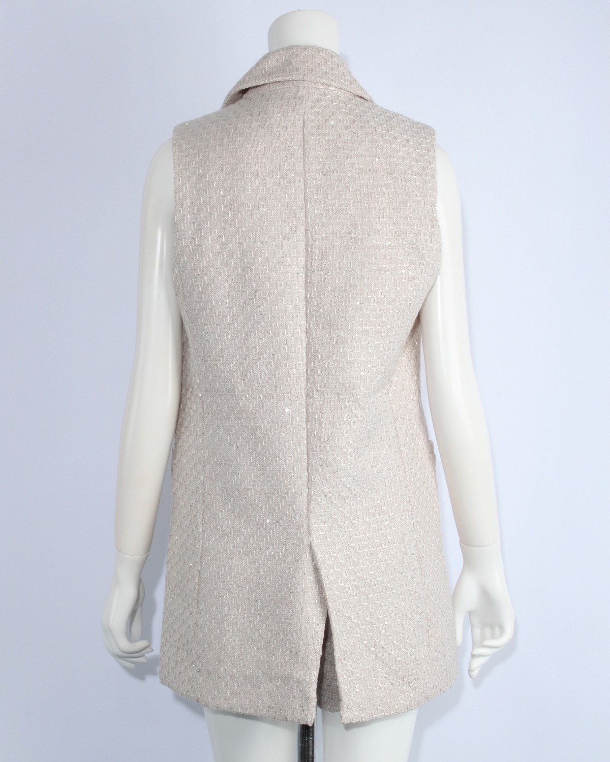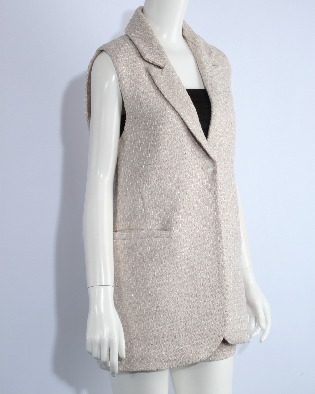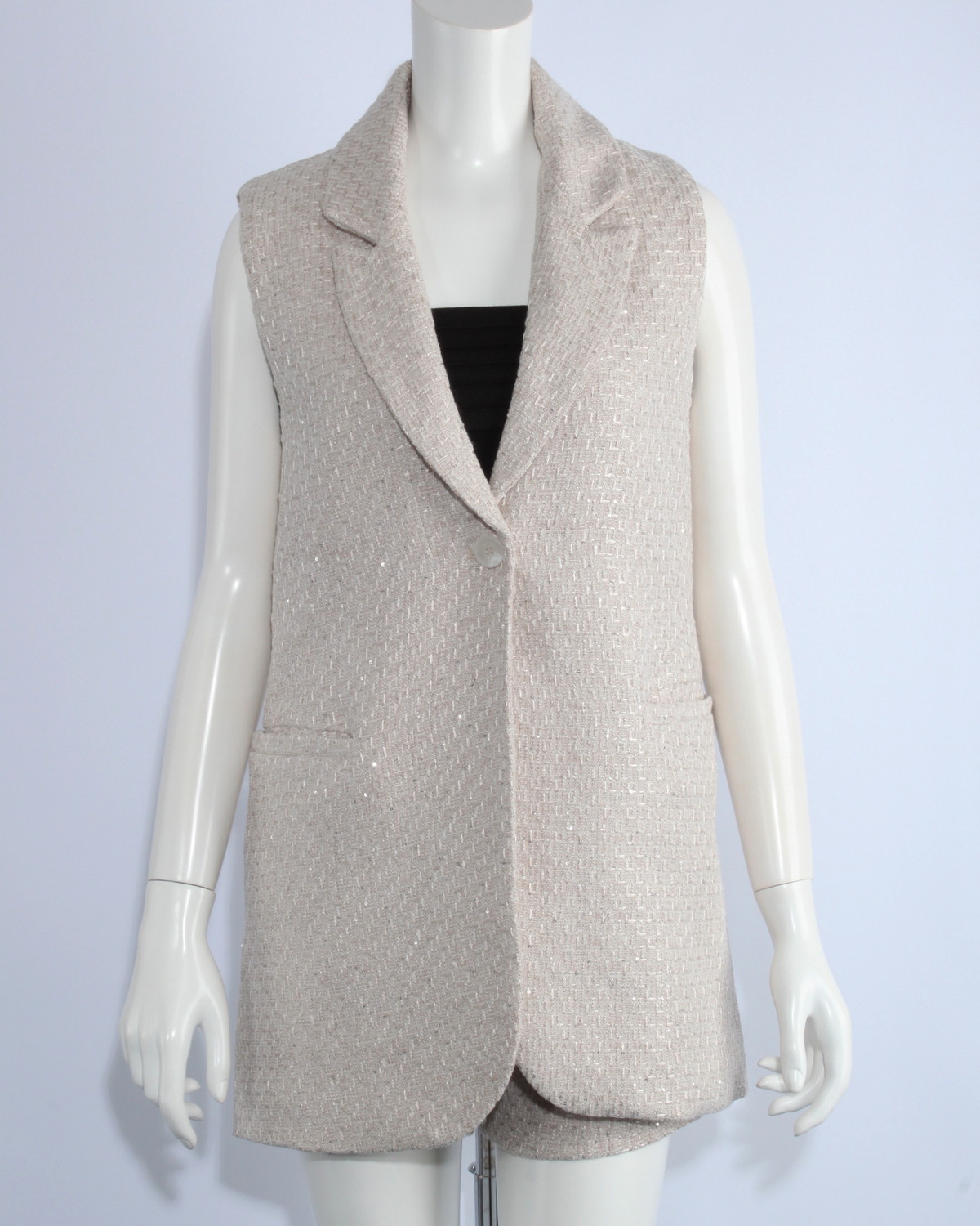 テーラードのツイードジレです。スパンコールをちりばめた生地で華やかさをプラス。同じ生地のショートパンツとセットアップ可能アイテムです。