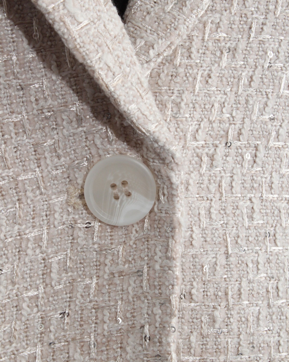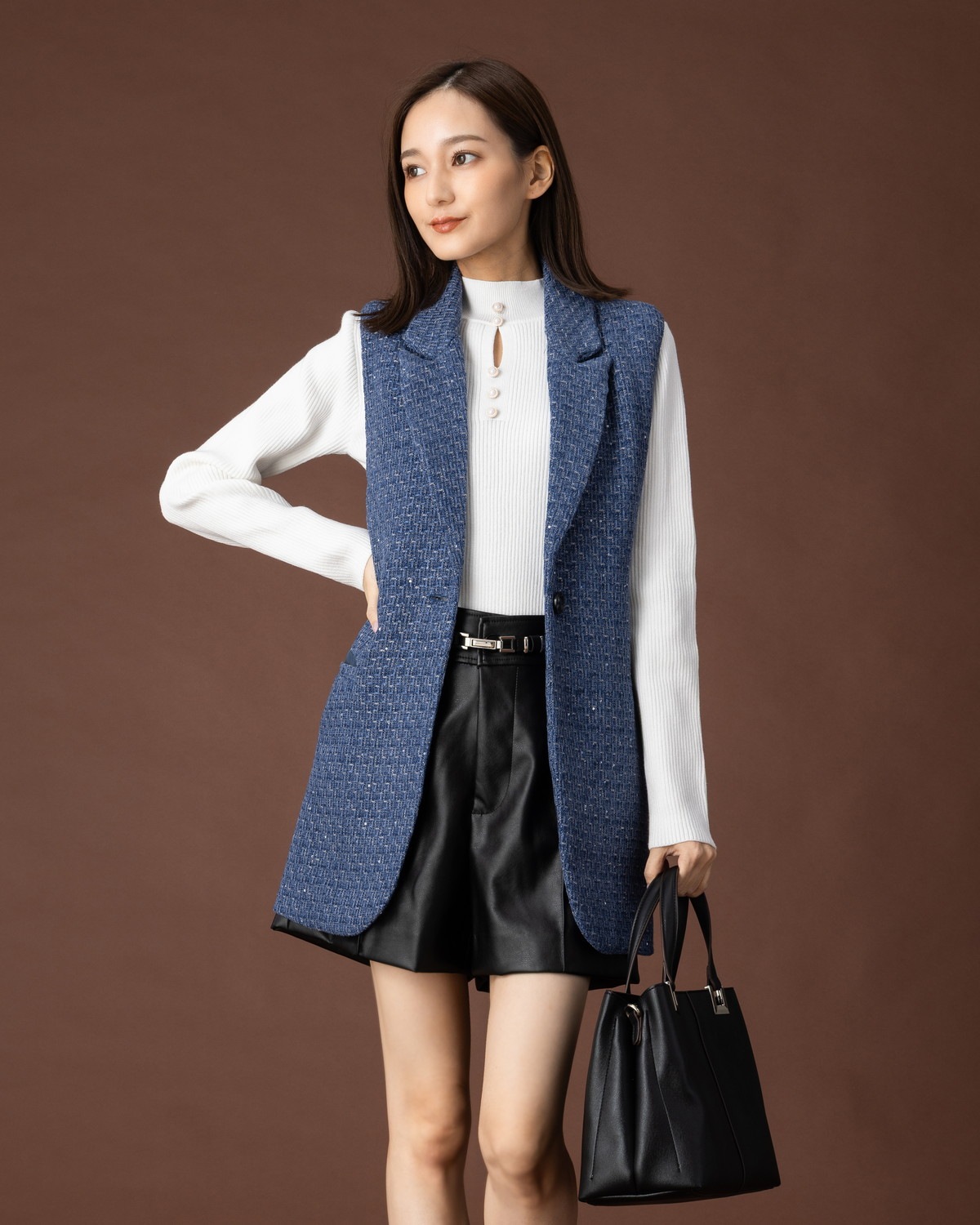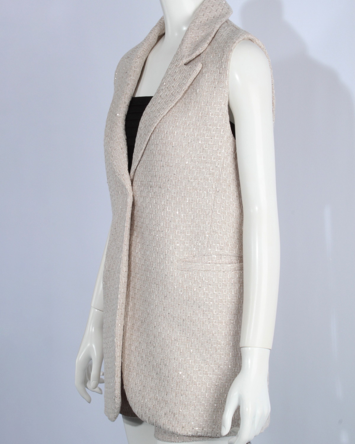 テーラードのツイードジレです。スパンコールをちりばめた生地で華やかさをプラス。同じ生地のショートパンツとセットアップ可能アイテムです。