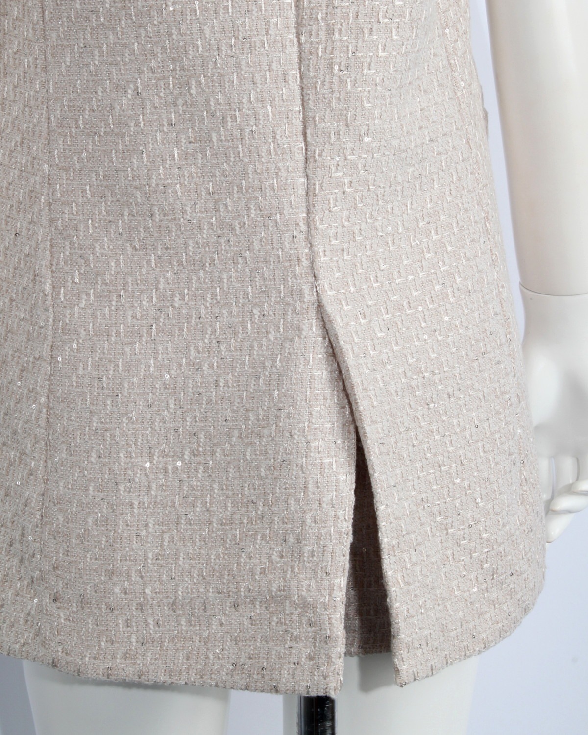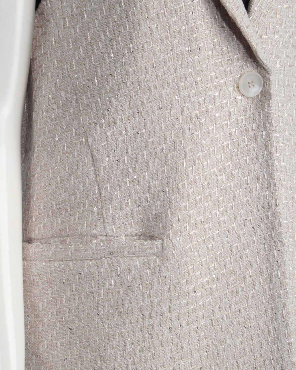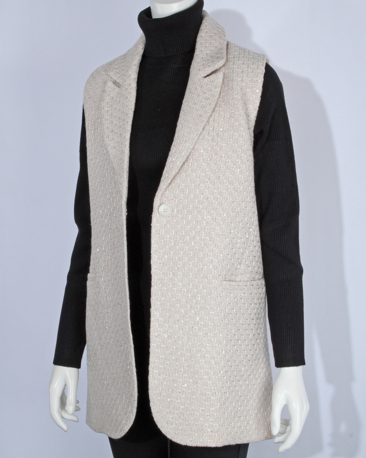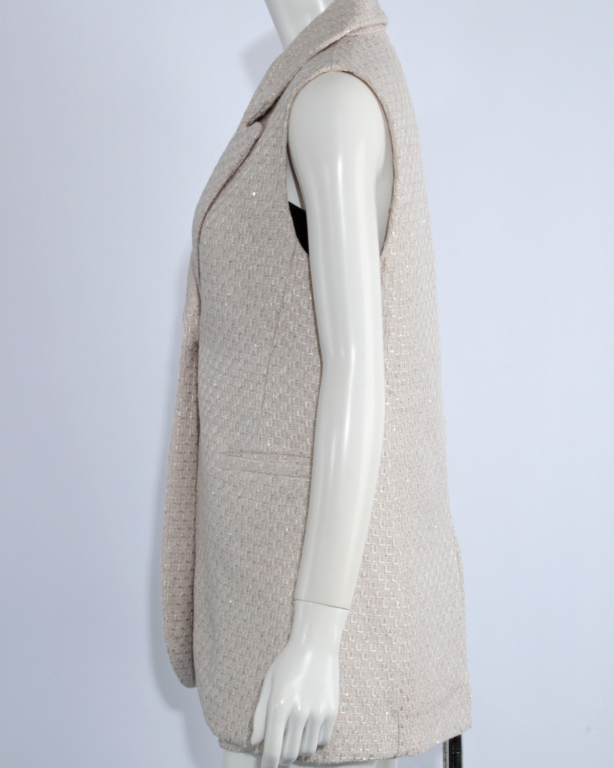 テーラードのツイードジレです。スパンコールをちりばめた生地で華やかさをプラス。同じ生地のショートパンツとセットアップ可能アイテムです。